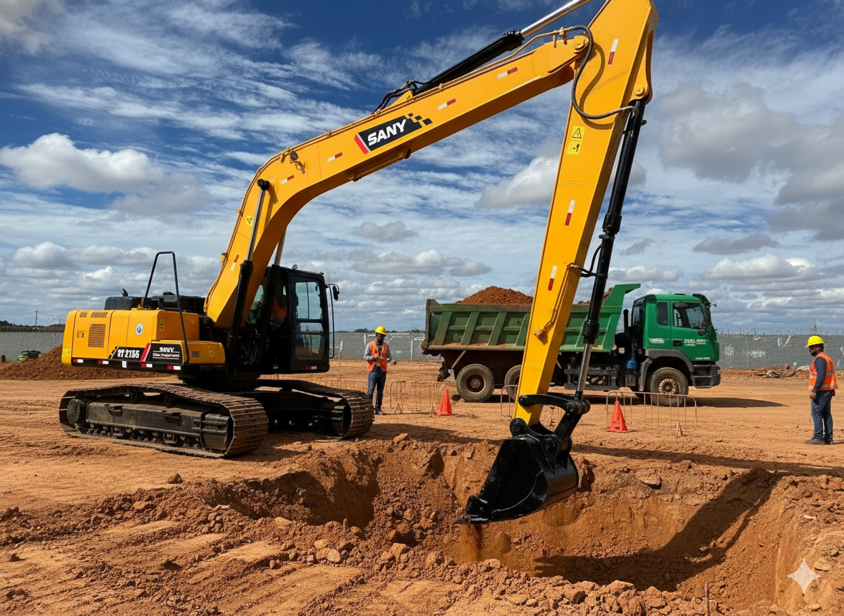 A SANY SY215C é uma escavadeira de médio porte (tipicamente na classe de 20 a 23 toneladas) ideal para uma vasta gama de aplicações, desde escavação de valas e carregamento de caminhões até demolição leve. O que a torna uma favorita entre empreiteiros e empresas de locação de máquinas pesadas?